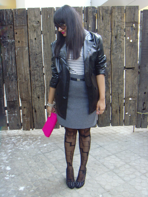 Those patterned tights look great! and the bag does add the right pop of colour to the monochromatic outfit.