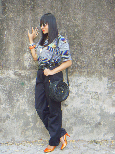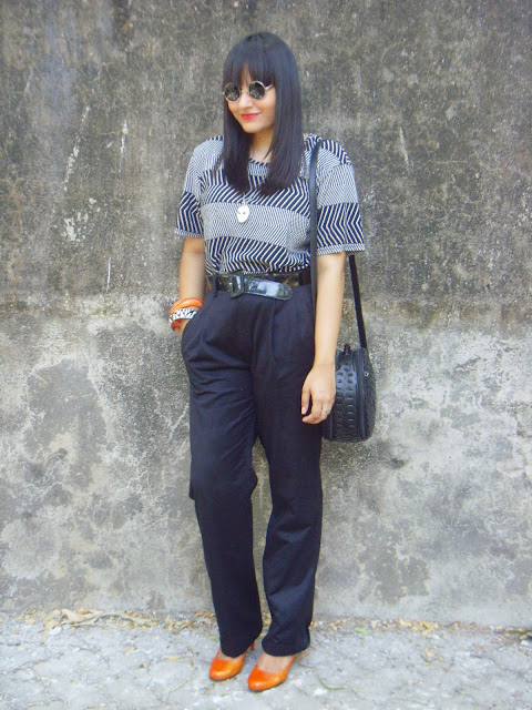 { t-shirt : vintage, pants : custom made, shoes : lokhandwala, bag : colaba, bangles : colaba, necklace : colaba, belt : and, sunnies : colaba }