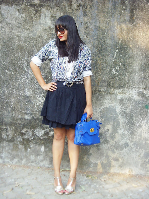 { skirt : western international market, london, white shirt : hill road, vintage shirt : grandma's, bag : globus, leopard necklace : colaba, hook necklace : diy, shoes : random lokhandwala boutique }