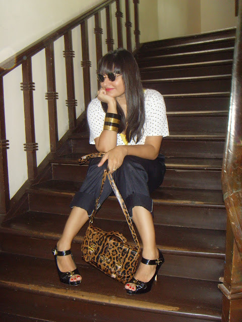{ pants : custom, yellow top : bought in spain, polka dot knotted top : linking road, shoes : random lokhandwala store, bag : bought in spain, sunnies : colaba, cuff : colaba }