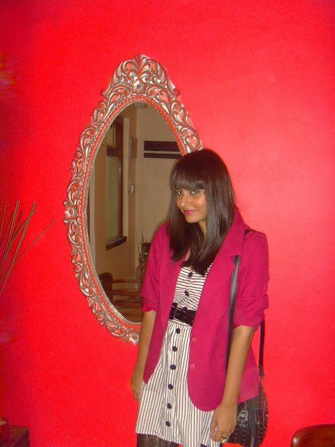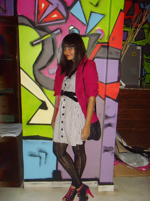 { dress : colaba, blazer : vintage, tights : gift from aunt, shoes : random lokhandwala shoe store, bag : colaba, ring : bought in spain, belt : and }
