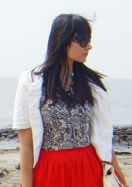 { skirt : hill road, t-shirt : fashion street, jacket : bought in london, shoes : random boutique, bag : bought in london, necklace : gift from naaz, embellished bangles : accessorize, turquoise bangle : colaba, watch : crawford market, sunnies : prada minimal baroque }