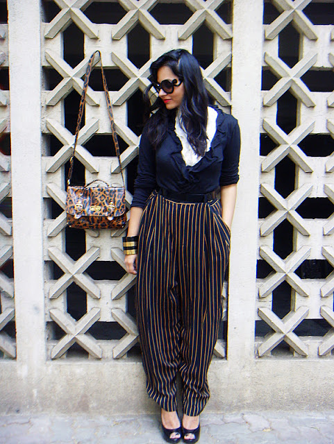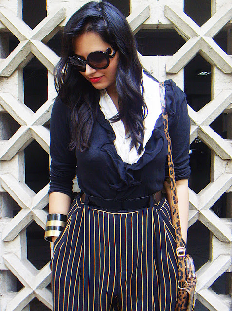 { wide leg pants : santacruz station road, white ruffle top : colaba, black ruffle cardigan : esprit, belt : and, bag : bought in spain, spider ring : bought in spain, cuff : colaba, shoes : aldo, sunnies : prada minimal baroque }