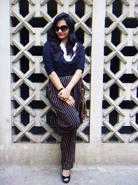 { wide leg pants : santacruz station road, white ruffle top : colaba, black ruffle cardigan : esprit, belt : and, bag : bought in spain, spider ring : bought in spain, cuff : colaba, shoes : aldo, sunnies : prada minimal baroque }